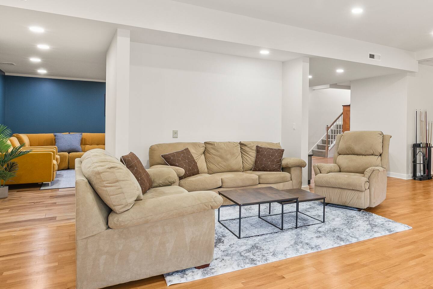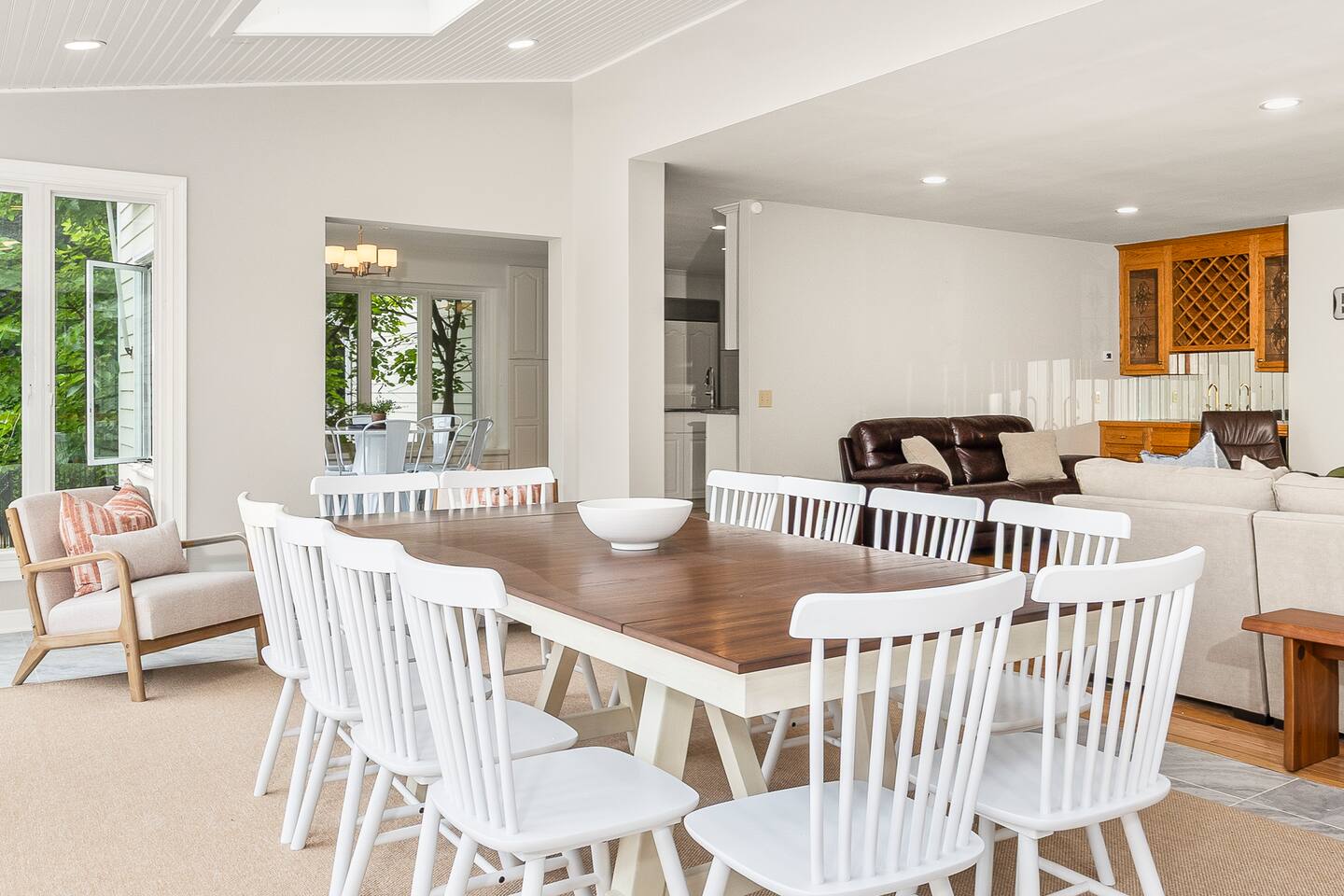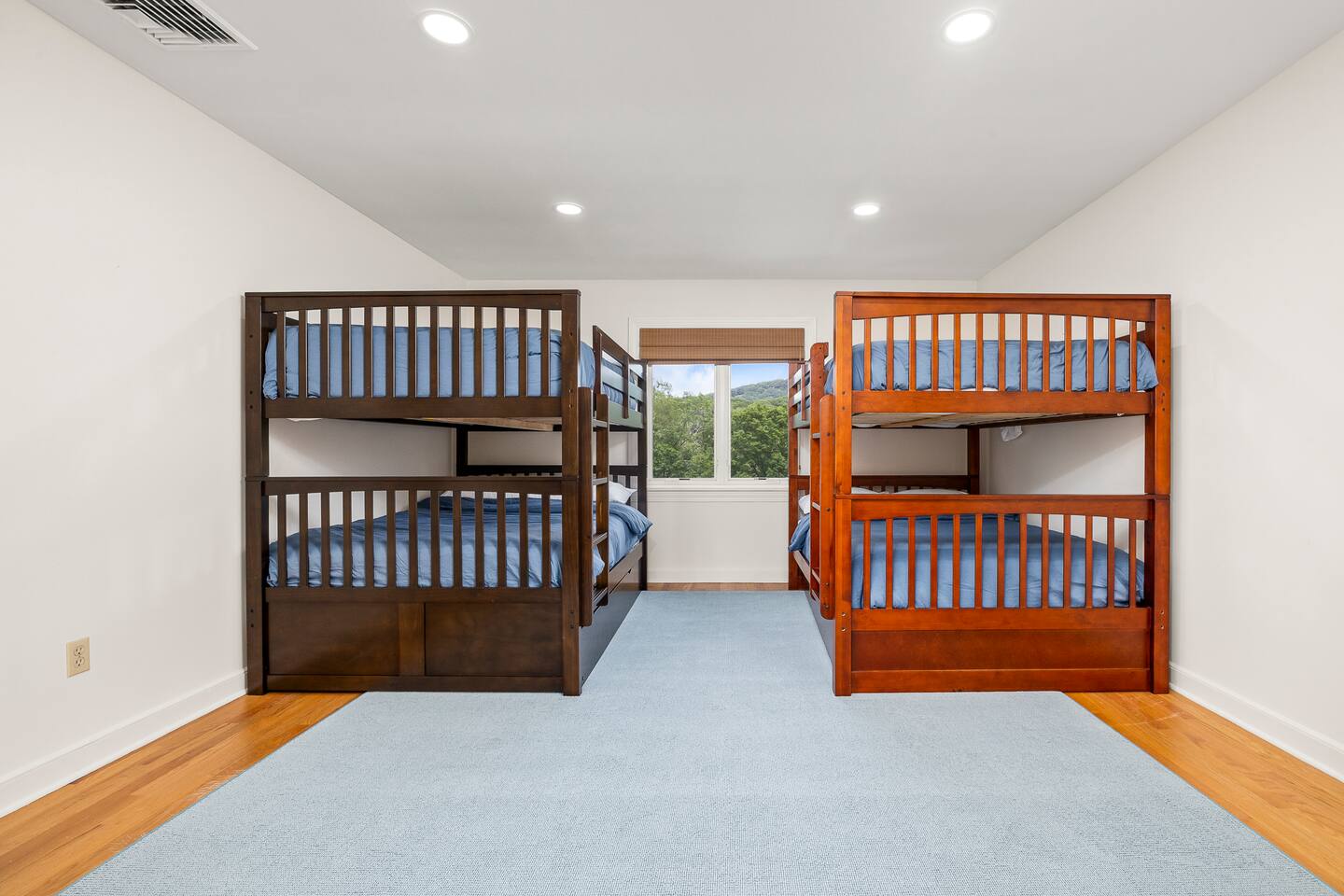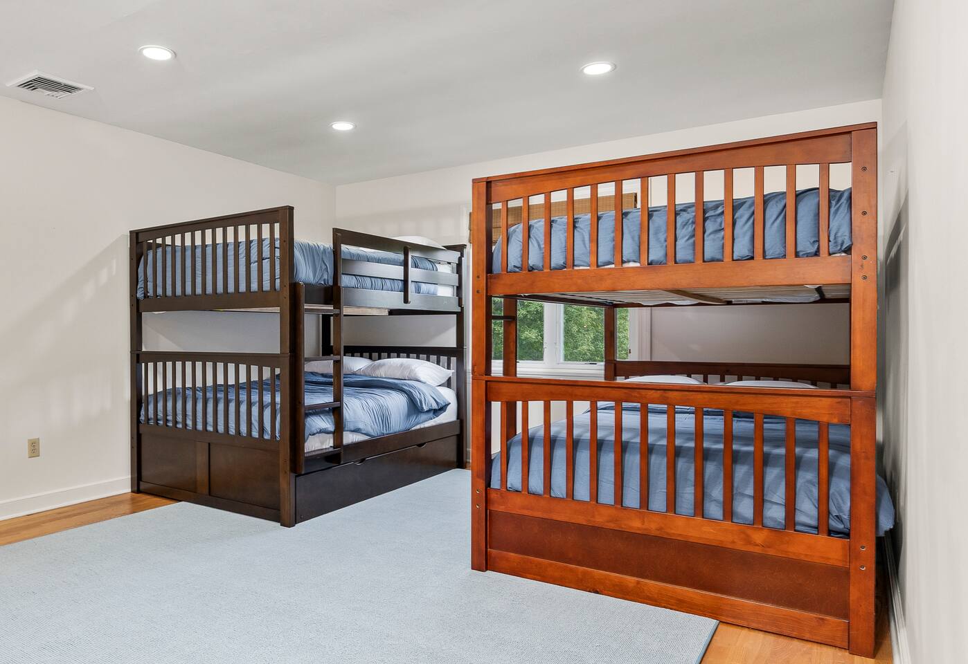 This work-from-home-friendly 4BR + office / 3BA lake house offers direct access to Candlewood Lake with stunning views from every front-facing room, the spacious deck, and the private dock. Enjoy top-tier amenities including a 50' pool, game room, theater, pool table, and dedicated office with a sleeper sofa. BEDROOMS ✔ Bedroom 1: King bed, ensuite bath, and jacuzzi tub (sleeps 2) ✔ Bedroom 2: King bed, ensuite bath (sleeps 2) ✔ Bedroom 3: King bed, shared bath (sleeps 2) ✔ Bedroom 4: Kids Room w/ two full-size bunk beds + single trundle beds (sleeps 9) ✔ Office: Pull-out full sleeper sofa (sleeps 2) UPSTAIRS KITCHEN ✔ Fully equipped with coffee maker, dishwasher, microwave, toaster, cookware, utensils & more DOWNSTAIRS KITCHEN ✔ Fully equipped with coffee maker, dishwasher, microwave, toaster, cookware, utensils & more OUTDOOR SPACE ✔ Large pool, propane grill, outdoor seating for 16 ✔ Private dock with space for one 25' boat. ✔ Lake access with 2 paddleboards, 2 canoes, and 2 kayaks. Lifejackets provided. ✔ The pool season generally operates from Memorial Day through Labor Day. Depending on weather conditions, it may remain open through the end of September. Please inquire for confirmation. OTHER AMENITIES ✔ High-speed Wi-Fi, central heat, central air, linens & towels ✔ Driveway parking for 6 cars