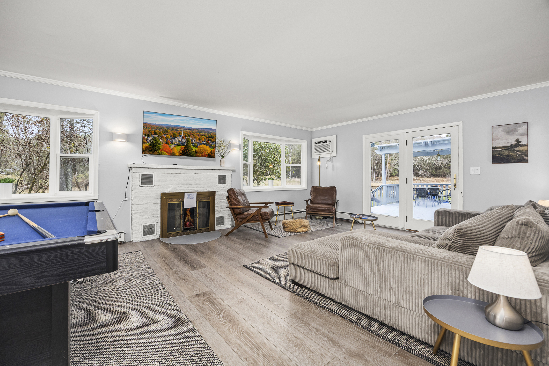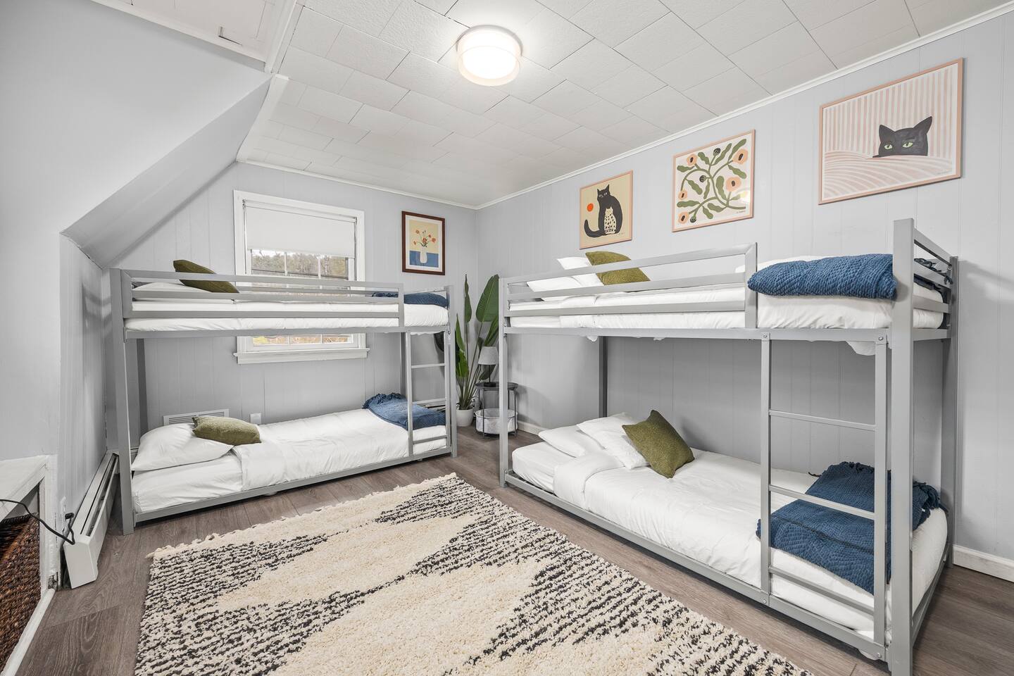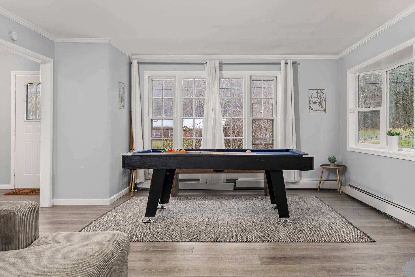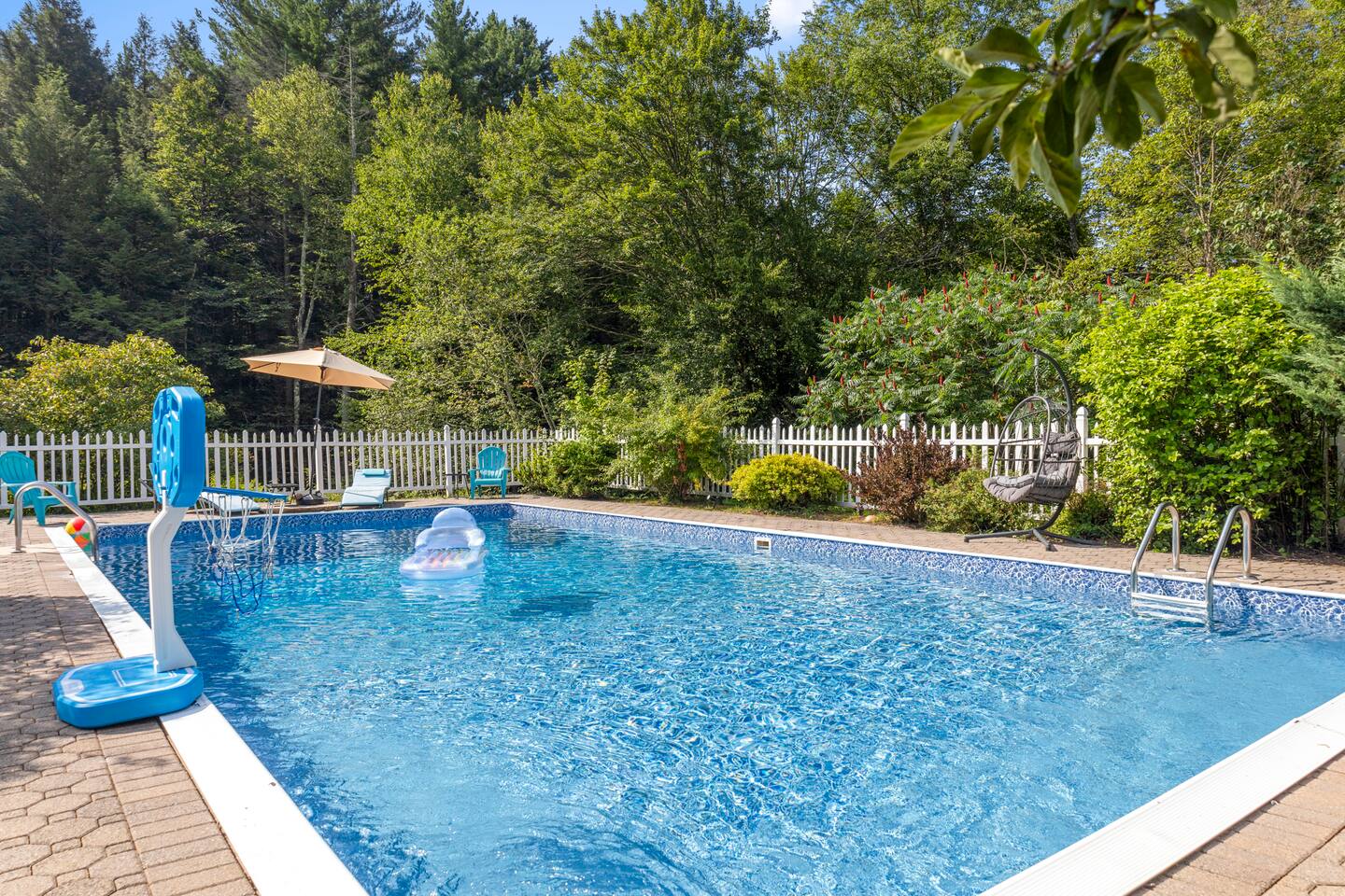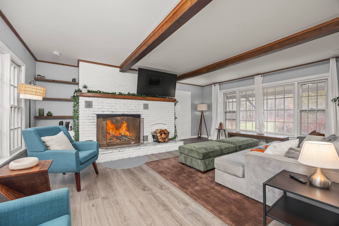 BEDROOMS AND BATHROOM ✔ 5 Bedrooms featuring a mix of king, queen, and twin bunk beds ✔ 3.5 Bathrooms (one with a standard tub and one with a soaker tub) LIVING ROOMS (2) ✔ 2 Large sofas & lounge chairs ✔ 2 40" HDTVs ✔ Fireplace w/ four logs provided to start fire ✔ Pool table ✔ Keyboard piano KITCHEN ✔ 8-person dining table with 8 chairs ✔ 4 bar stools ✔ A fully equipped kitchen comes with all essentials—dishwasher, microwave, refrigerator, toaster, cookware, and plenty of utensils. ✔ Keurig K-cup coffee maker ✔ French press OUTDOOR SPACE ✔ Large saltwater pool with lounge furniture ✔ Deck lounge seating on the patio ✔ 2 Adirondack chairs with umbrellas ✔ Small pond w/ 2 kayaks and 2 lifevests OTHER AMENITIES ✔ Children’s play loft with drum set, hockey table, and games ✔ 1,000-square-foot back deck off the radiant sunroom