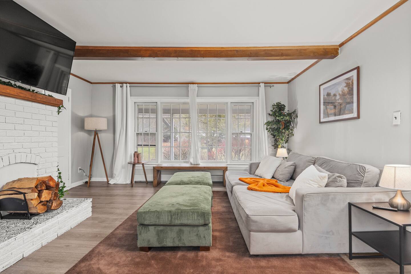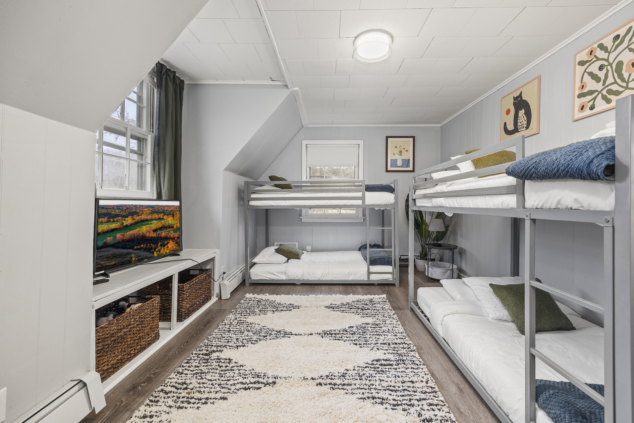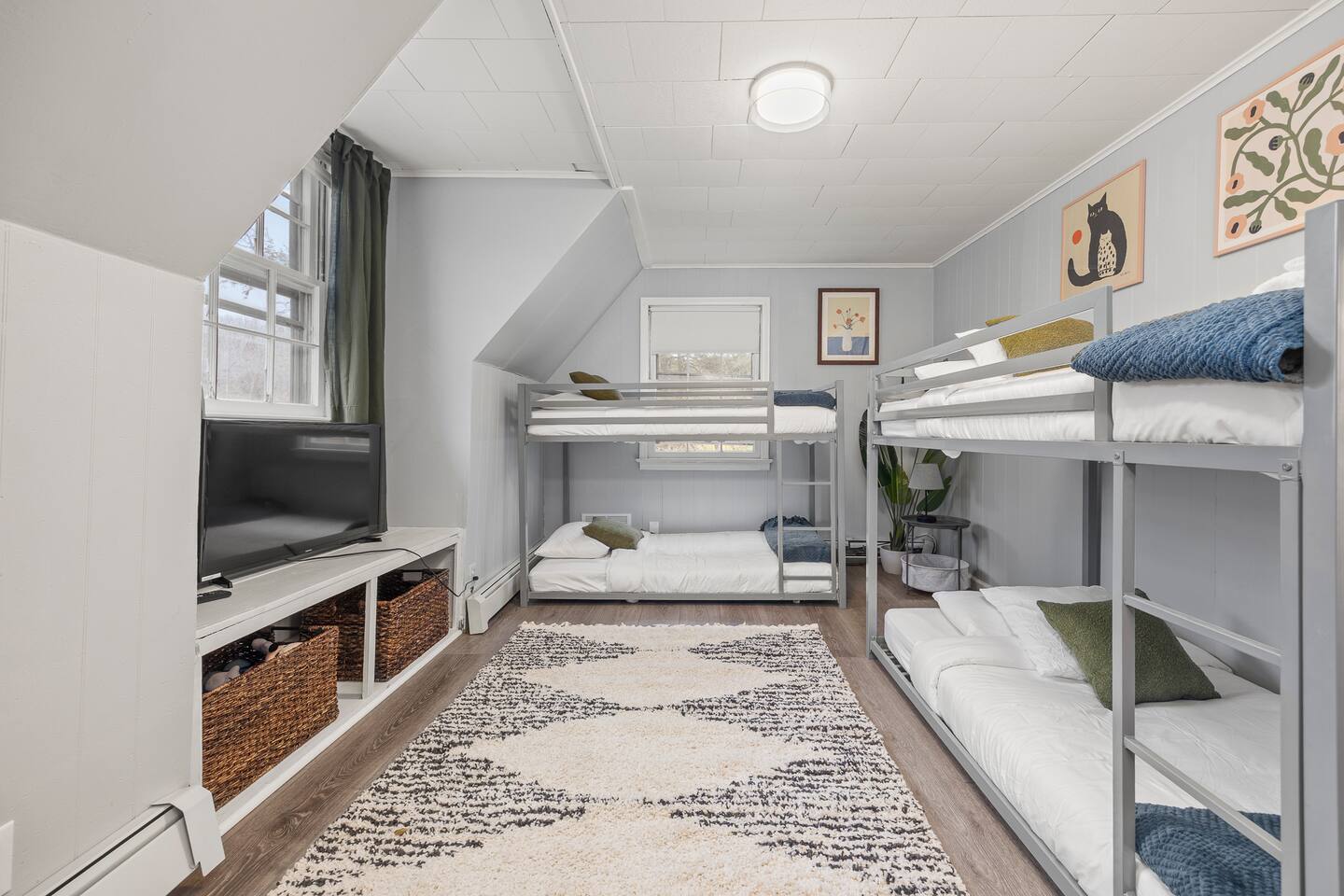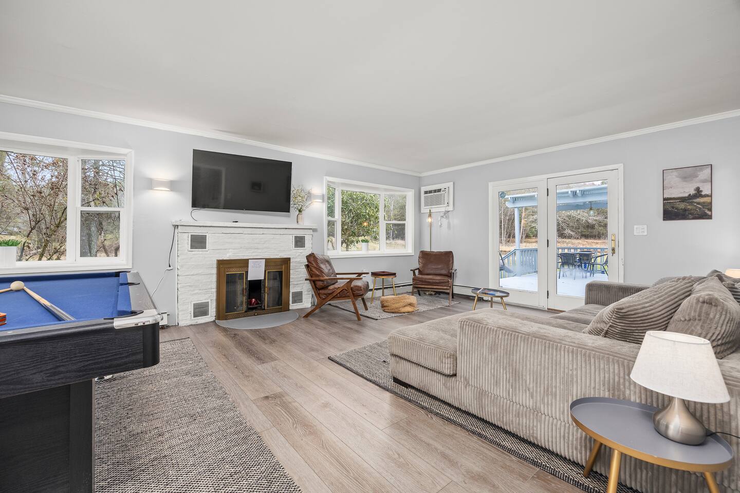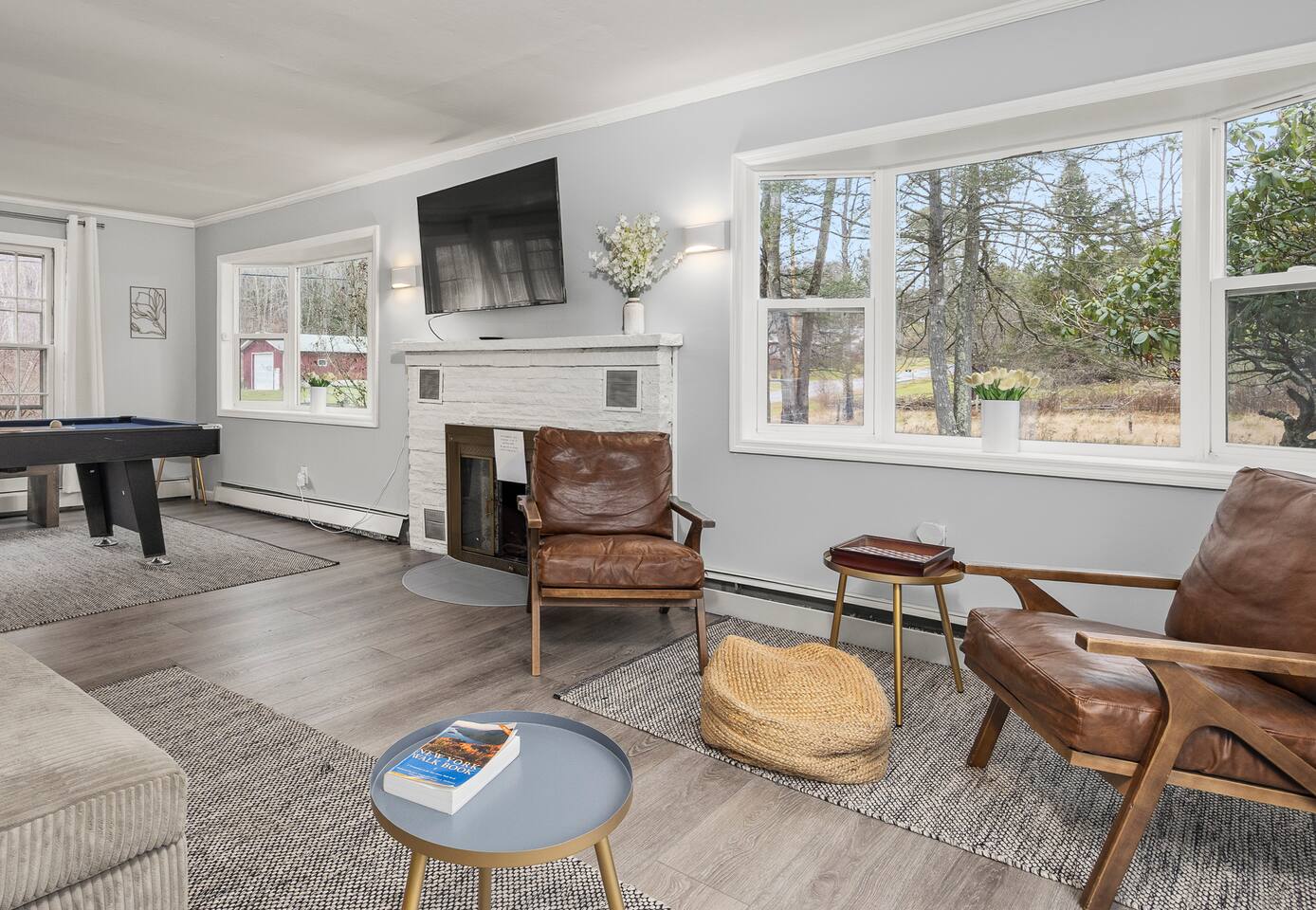 BEDROOMS AND BATHROOM ✔ 5 Bedrooms featuring a mix of king, queen, and twin bunk beds ✔ 3.5 Bathrooms (one with a standard tub and one with a soaker tub) LIVING ROOMS (2) ✔ 2 Large sofas & lounge chairs ✔ 2 40" HDTVs ✔ Fireplace w/ four logs provided to start fire ✔ Pool table ✔ Keyboard piano KITCHEN ✔ 8-person dining table with 8 chairs ✔ 4 bar stools ✔ A fully equipped kitchen comes with all essentials—dishwasher, microwave, refrigerator, toaster, cookware, and plenty of utensils. ✔ Keurig K-cup coffee maker ✔ French press OUTDOOR SPACE ✔ Large saltwater pool with lounge furniture ✔ Deck lounge seating on the patio ✔ 2 Adirondack chairs with umbrellas ✔ Small pond w/ 2 kayaks and 2 lifevests OTHER AMENITIES ✔ Children’s play loft with drum set, hockey table, and games ✔ 1,000-square-foot back deck off the radiant sunroom