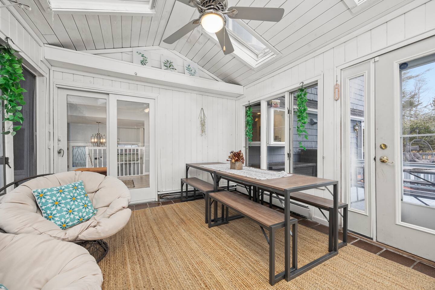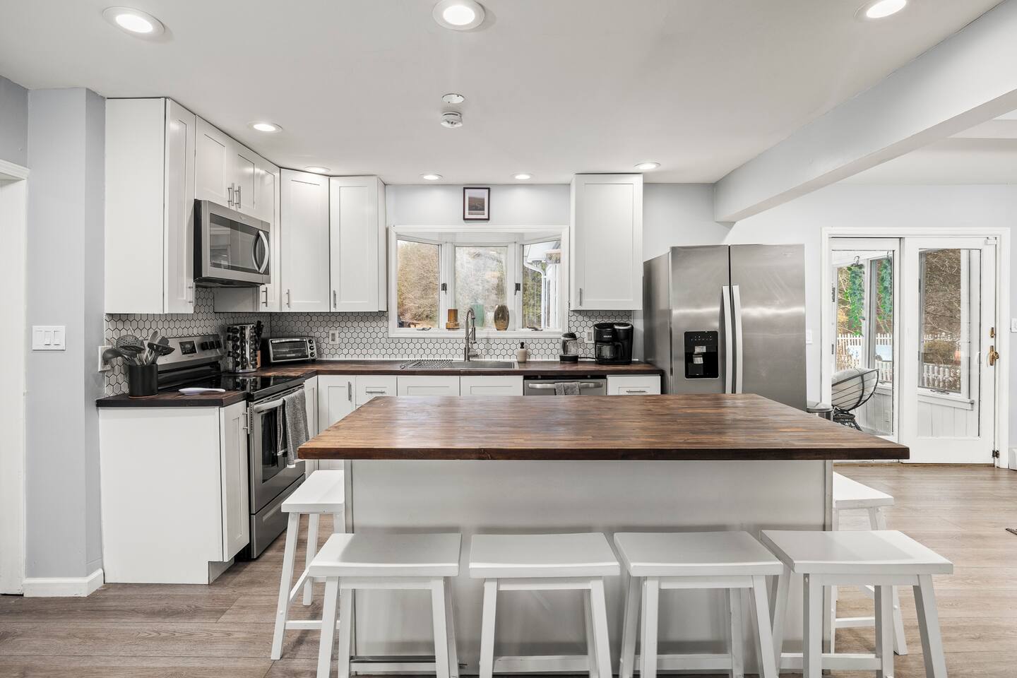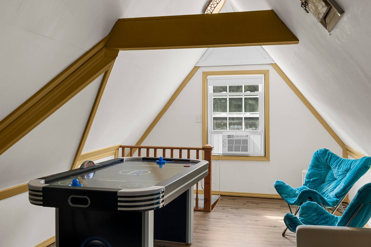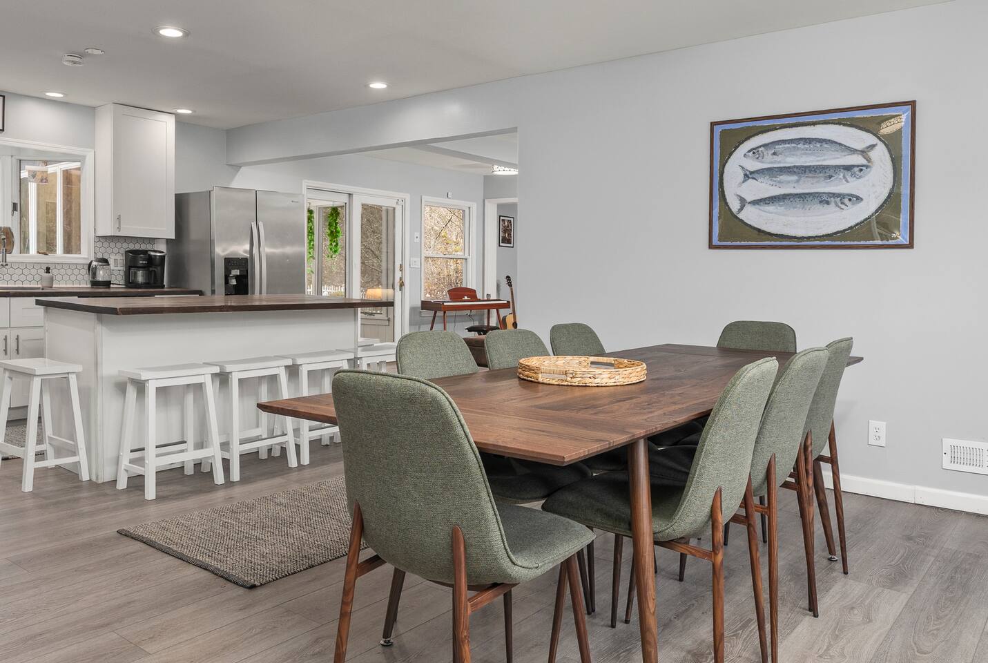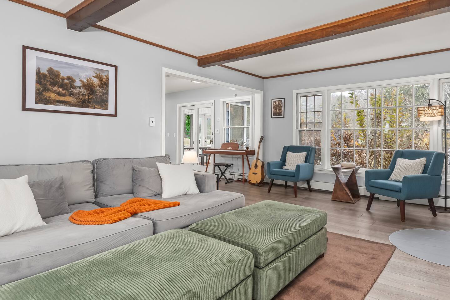 BEDROOMS AND BATHROOM ✔ 5 Bedrooms featuring a mix of king, queen, and twin bunk beds ✔ 3.5 Bathrooms (one with a standard tub and one with a soaker tub) LIVING ROOMS (2) ✔ 2 Large sofas & lounge chairs ✔ 2 40" HDTVs ✔ Fireplace w/ four logs provided to start fire ✔ Pool table ✔ Keyboard piano KITCHEN ✔ 8-person dining table with 8 chairs ✔ 4 bar stools ✔ A fully equipped kitchen comes with all essentials—dishwasher, microwave, refrigerator, toaster, cookware, and plenty of utensils. ✔ Keurig K-cup coffee maker ✔ French press OUTDOOR SPACE ✔ Large saltwater pool with lounge furniture ✔ Deck lounge seating on the patio ✔ 2 Adirondack chairs with umbrellas ✔ Small pond w/ 2 kayaks and 2 lifevests OTHER AMENITIES ✔ Children’s play loft with drum set, hockey table, and games ✔ 1,000-square-foot back deck off the radiant sunroom
