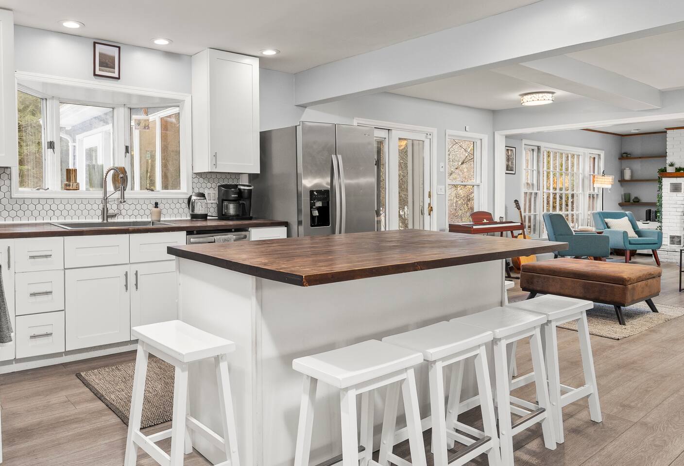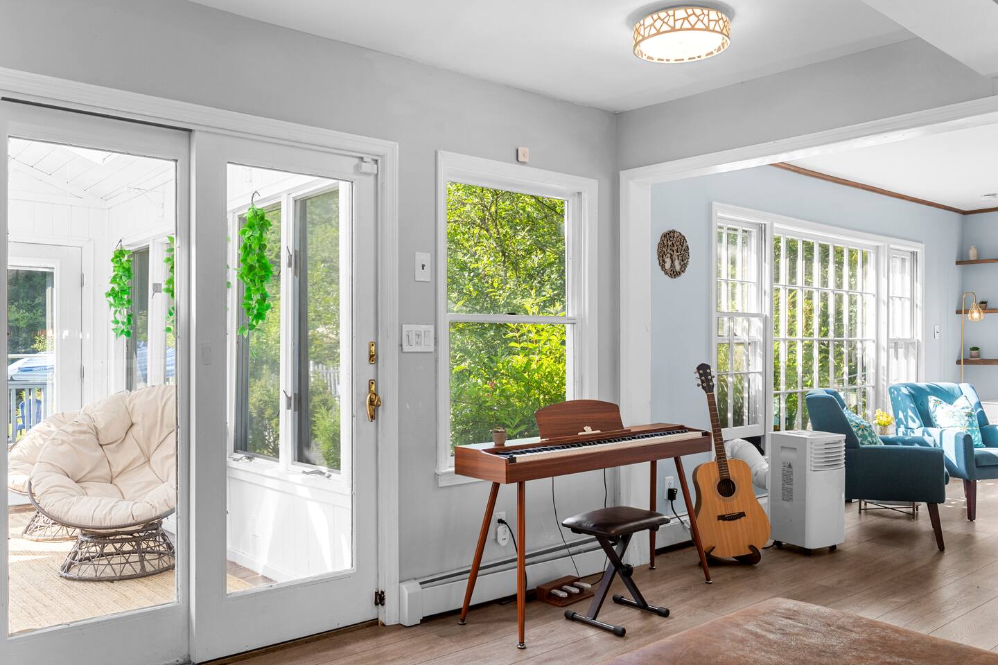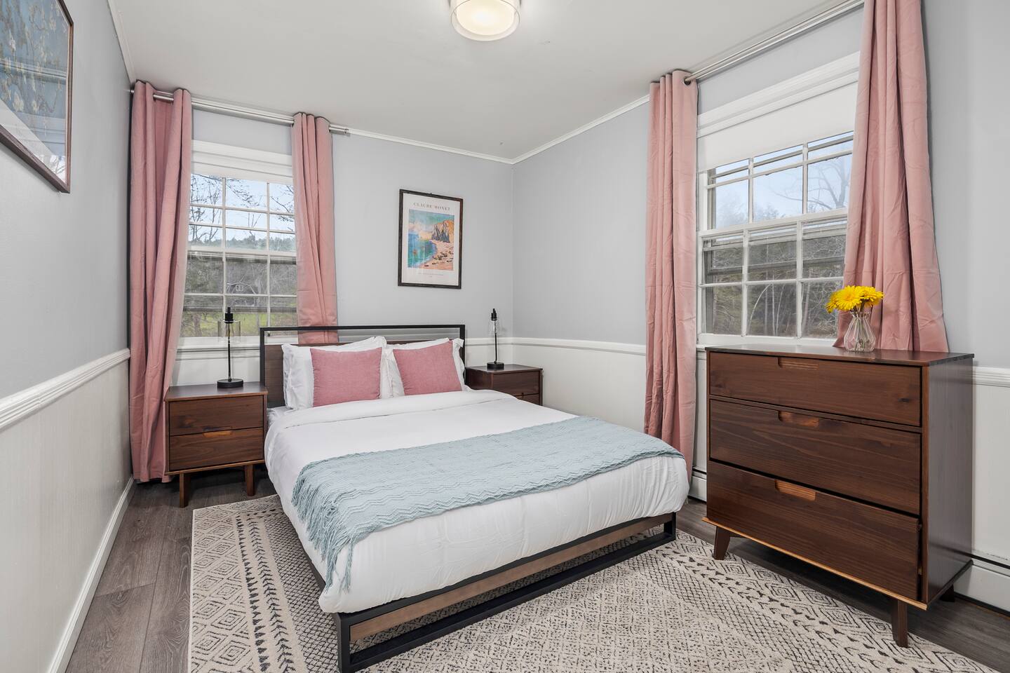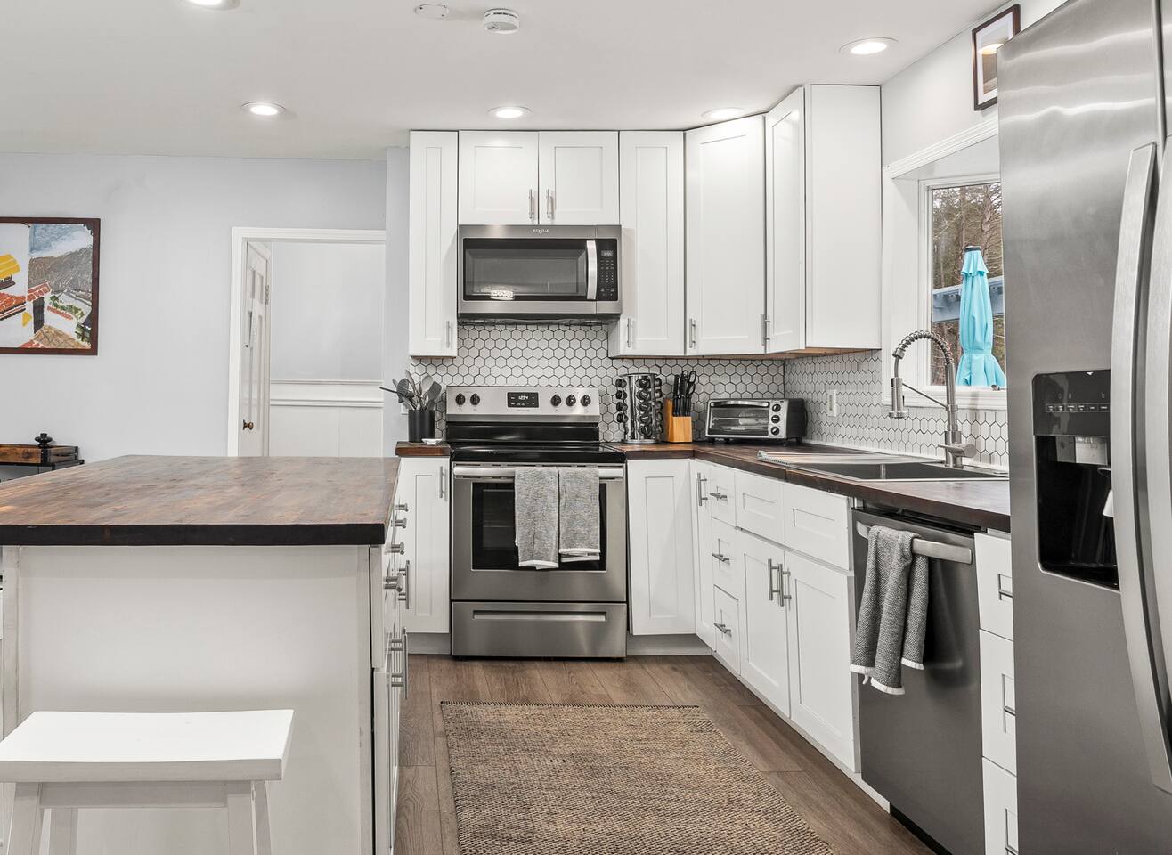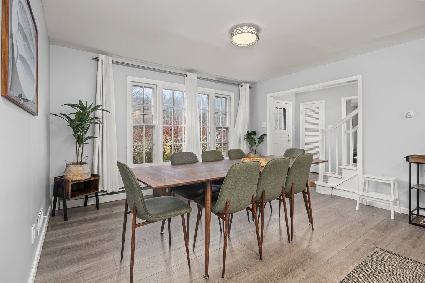 BEDROOMS AND BATHROOM ✔ 5 Bedrooms featuring a mix of king, queen, and twin bunk beds ✔ 3.5 Bathrooms (one with a standard tub and one with a soaker tub) LIVING ROOMS (2) ✔ 2 Large sofas & lounge chairs ✔ 2 40" HDTVs ✔ Fireplace w/ four logs provided to start fire ✔ Pool table ✔ Keyboard piano KITCHEN ✔ 8-person dining table with 8 chairs ✔ 4 bar stools ✔ A fully equipped kitchen comes with all essentials—dishwasher, microwave, refrigerator, toaster, cookware, and plenty of utensils. ✔ Keurig K-cup coffee maker ✔ French press OUTDOOR SPACE ✔ Large saltwater pool with lounge furniture ✔ Deck lounge seating on the patio ✔ 2 Adirondack chairs with umbrellas ✔ Small pond w/ 2 kayaks and 2 lifevests OTHER AMENITIES ✔ Children’s play loft with drum set, hockey table, and games ✔ 1,000-square-foot back deck off the radiant sunroom